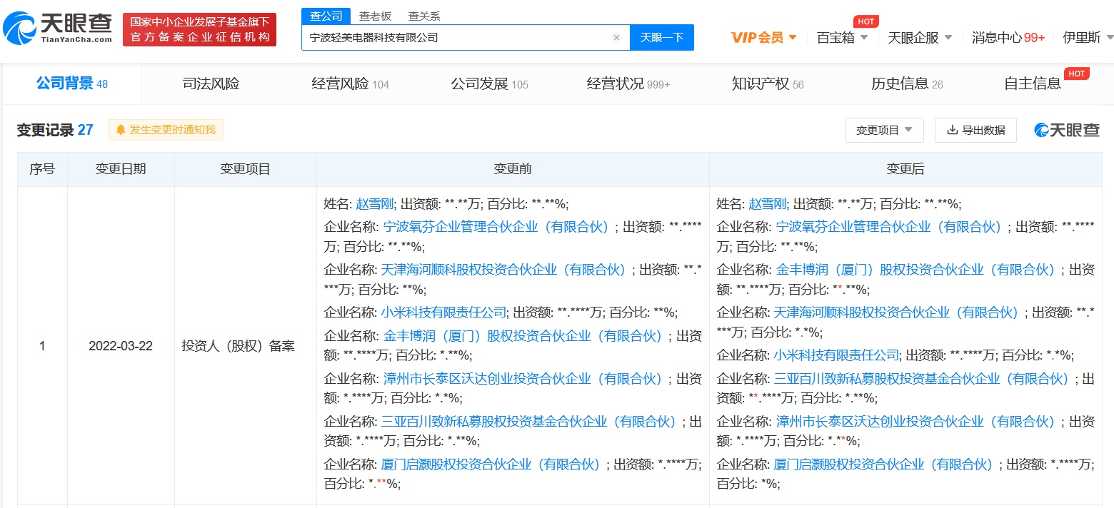 智通财经APP获悉,天眼查APP显示,宁波轻美电器科技有限公司(下称:轻美电器)发生工商变更,新增百度关联公司三亚百川致新私募股权投资基金合伙企业(有限合伙)为股东。