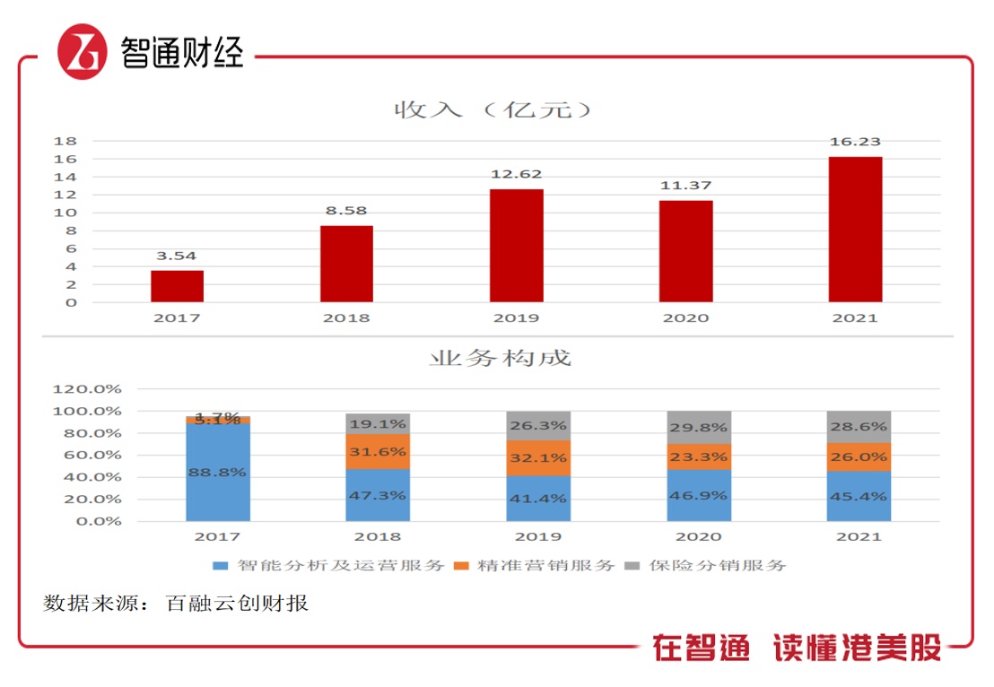 百融云创是中国领先的独立AI技术平台,金融AI应用行业港股SaaS龙头,依托自主研发的 SaaS 云平台,结合AI 技术、云计算、区块链等技术,为金融机构提供智能分析与运营服务、精准营销服务及保险分销服务。该公司近几年发展较快,2017-2021年收入复合增长率达到46.32%。