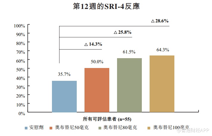 研究结果表明,轻中度系统性红斑狼疮患者口服奥布替尼的安全性和耐受性良好。在所有接受治疗可评估的患者中观察到疗效呈剂量依赖性。每日一次口服安慰剂、奥布替尼50毫克、80毫克和100毫克,第12周SRI-4(SLE应答者指数4)的应答率分别为37.5%、50.0%、61.5%和64.3%。简言之,此次II期临床中,奥布替尼实验组剂量与疗效呈正相关关系,显示出了较为积极的临床效果。