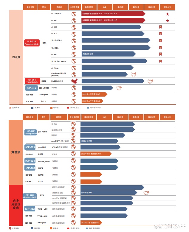 在实体瘤治疗领域,诺诚健华的潜在BIC分子药——FGFR抑制剂ICP-192和泛TRK抑制剂ICP-723,则将为公司建立坚实的实体瘤管线基础。尤其是ICP-192,在国内暂无FGFR抑制剂获批上市的市场环境内,该产品后续潜力值得期待。而针对SHP2和CCR8等新型靶点的快速开发的早期管线,包括ICP-033、ICP-189、ICP-B05、ICP-915和ICP-B03,有望使公司能够为满足中国和全球实体瘤患者的庞大需求提供具有竞争力的治疗方案。