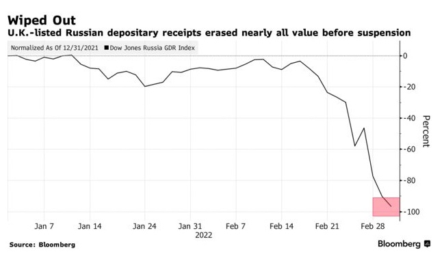 尽管俄罗斯监管机构尽了最大努力,但即便是有限的重新开放交易,股市或许也会是一片混乱。俄罗斯公司的全球存托凭证在上个月被暂停交易之前暴跌了95%以上。自战争风险激增以来,与该国有业务往来的欧洲公司市值损失超过1000亿美元。全球指数已经将俄罗斯股票从他们的指标中移除。