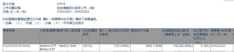 ETF增持招金矿业(01818)787.2万股,每股作价7.4港元,总金额约为5825.28万港元。增持后最新持股数目约为1.35亿股,最新持股比例为5.18%。