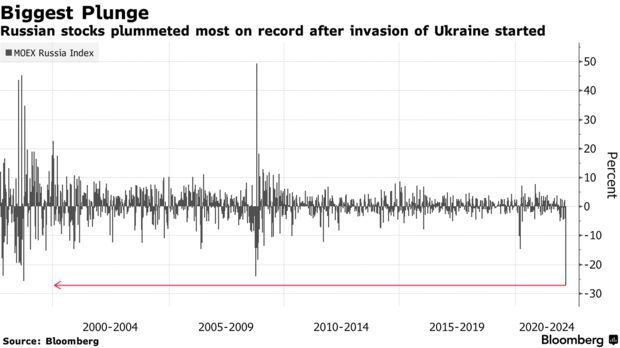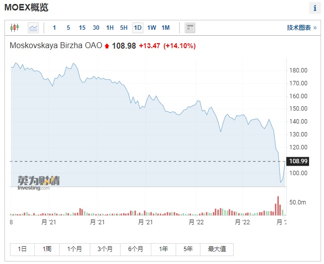 自俄乌危机风险飙升以来,在俄罗斯开展业务的欧洲公司市值缩水超过1000亿美元,俄罗斯公司的全球存托凭证在停牌前暴跌95%以上,俄罗斯股市也已被排除在全球基准股指之外。在2月24日俄乌冲突爆发当天,MOEX指数就暴跌了45%。