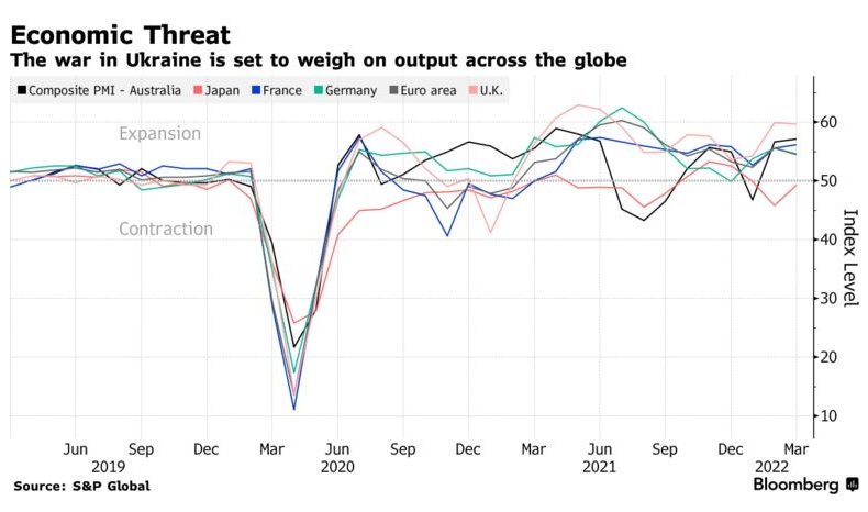 据3月份各国的PMI调查显示,尽管放松对疫情的限制在一定程度上让整体商业活动抵消了乌俄战初所带来的冲击,但商业信心的下降正威胁着各国未来几个月的经济增长。不断上升的成本也打击亚洲市场的信心,日本和澳大利亚的原材料价格分别达到14年来的高点和纪录高位。而与乌克兰接壤的欧元区,制造商们正面临着“前所未有”的零部件和原材料成本上涨,而这势必会推高通胀。