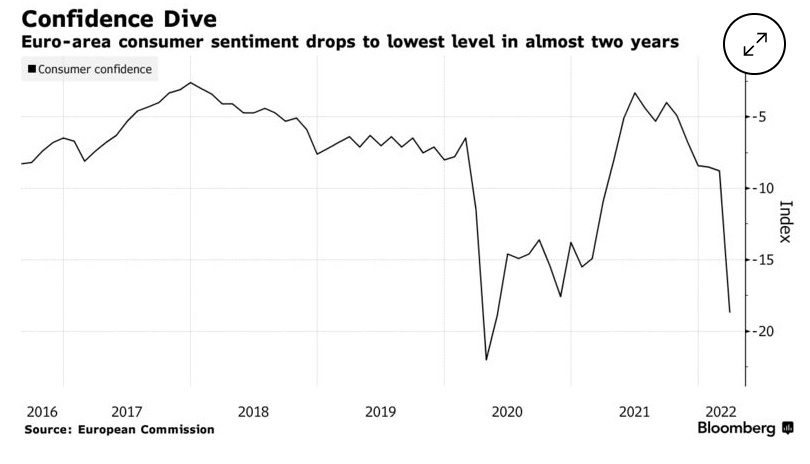 目前,英国和欧洲各国政府正试图通过减税以及提供更便宜的燃料和收入支持来减轻战争对家庭消费的影响。但由于目前对于冲突的最终走向仍不明朗,欧盟委员会的信心指标已跌至新冠疫情爆发之处以来的最低水平,另一方面,包括法国在内的一些国家的统计机构也因不确定性而暂停了相关预测。