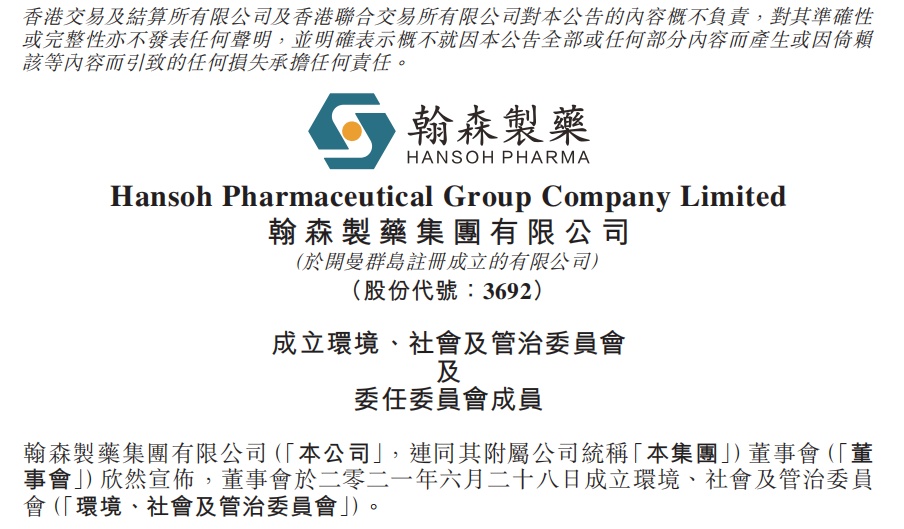 不断完善ESG治理架构 彰显翰森可持续发展决心