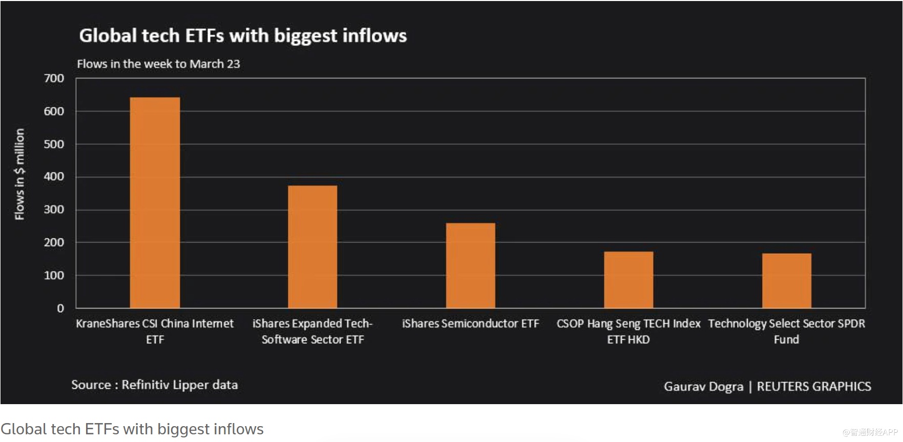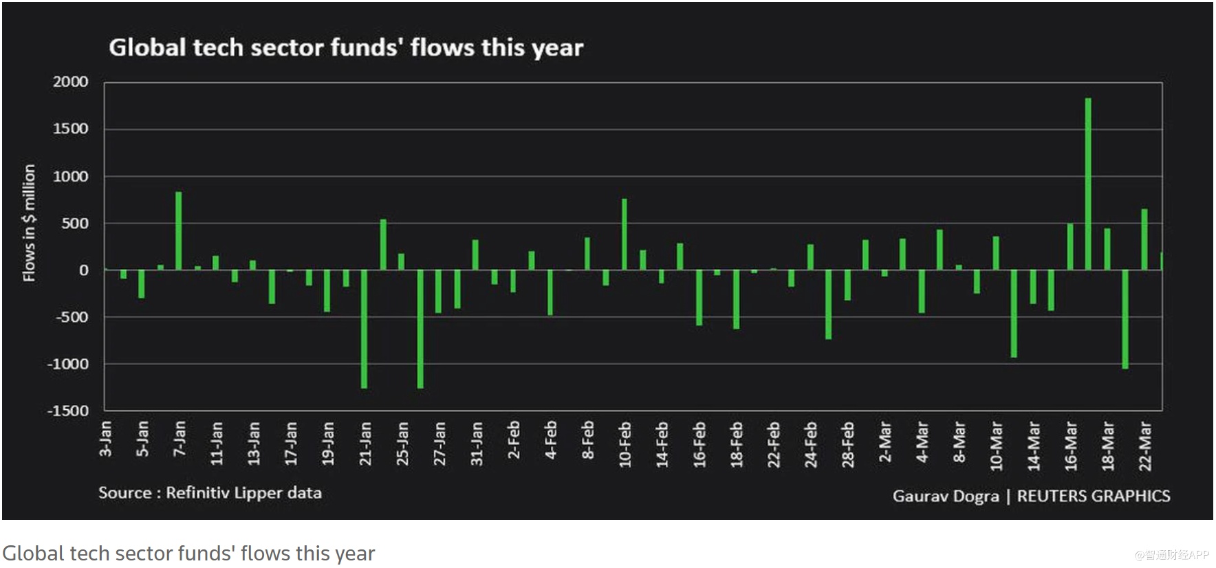 根据Refinitiv的数据,自3月16日以来,科技基金获得了价值25.5亿美元的资金流入,而今年头两个月的资金流出价值68.6亿美元。