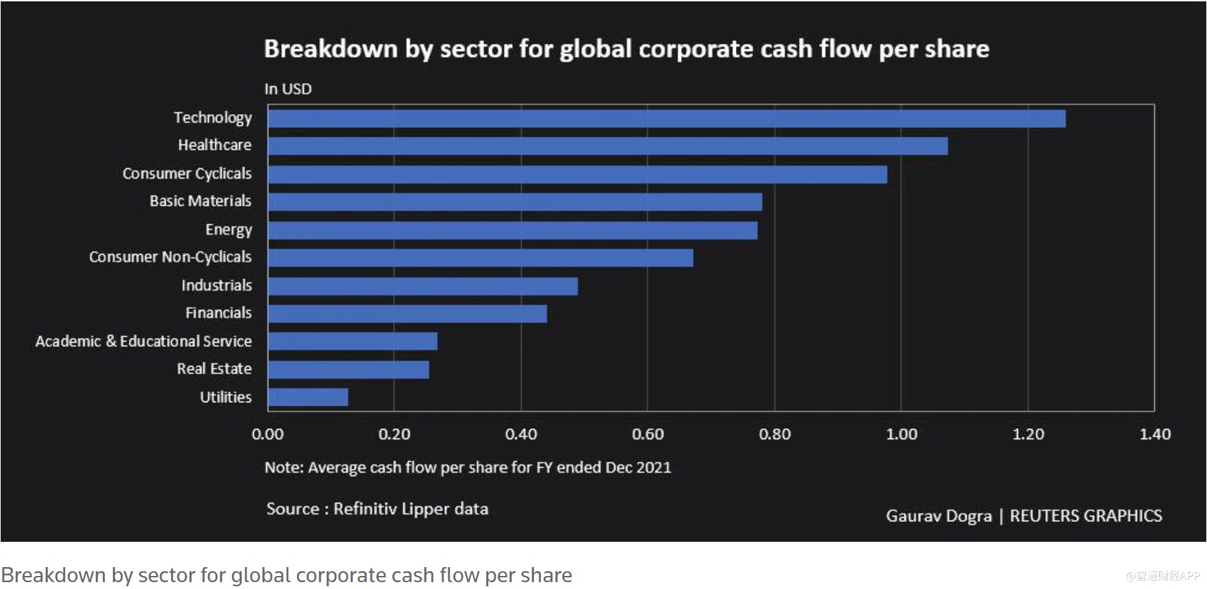 根据Refinitiv的数据,2021年全球科技行业的每股现金流为1.26美元,是主要行业中最高的。阿里巴巴(BABA.US)本周表示,已将其股票回购计划的规模从150亿美元扩大到250亿美元。