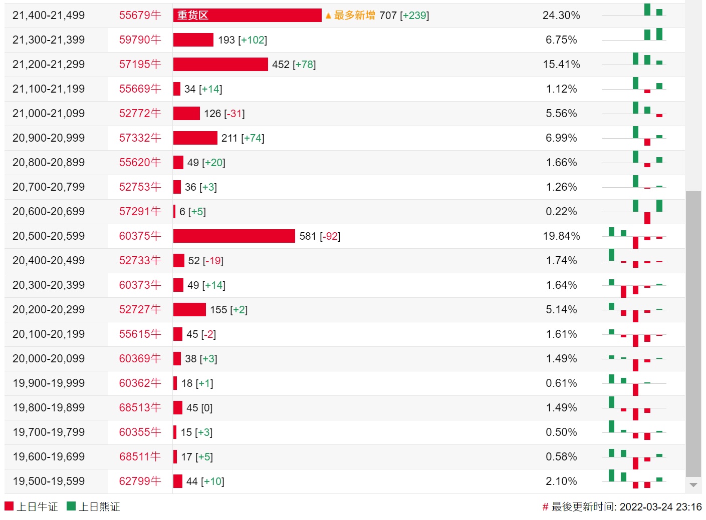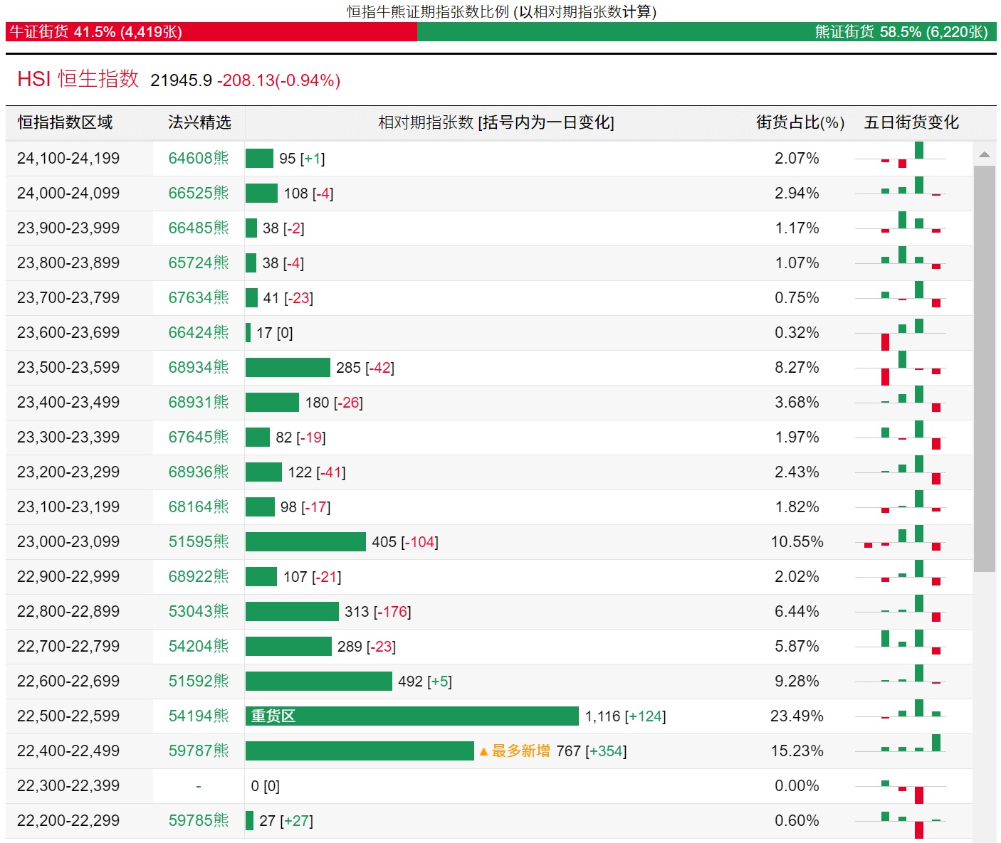 法兴恒指牛熊证街货分布图中的数据显示,熊证街货重货区在22500-22599区间,该区间最新熊证数量为1116张,较上一交易日增加124张;最多新增在22400-22499区间,该区间最新熊证数量为767张,较上一交易日增加354张。