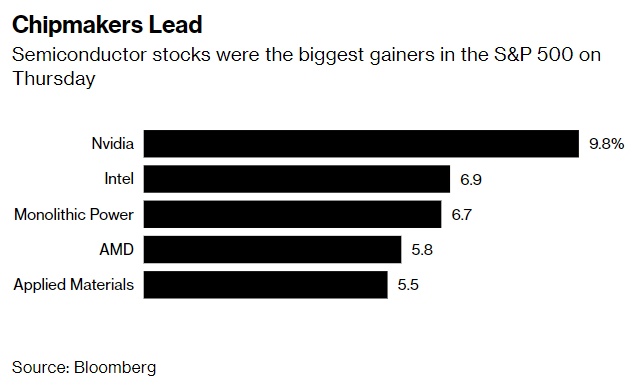 数据显示,英伟达股价周四上涨9.82%,成为标普500指数中涨幅最大的公司。此前,该公司告知投资者,其首要任务是用现金扩张业务,而不是回购股票,这帮助提振了投资者对芯片制造商前景的信心。这也是该公司自去年11月以来的最大涨幅,英特尔(INTC.US)和AMD(AMD.US)在其推动下涨幅都超过了5%。
