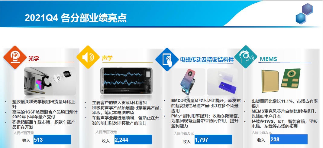 业绩报告显示,瑞声科技多项业务取得阶段性进展,形成多元发展格局。声学方面:瑞声科技已成功拿到国内头部新能源汽车品牌整体声学方案业务,将在客户即将推出的新车型上采用;光学方面:模组业务从中低端市场,开始向中高端市场突破,WLG玻塑混合镜头1G6P目标2022年下半年开始量产交付,光学传动50M