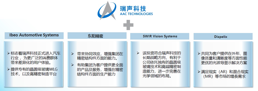 此外,瑞声科技在过去两年其实进行了非常多的战略投资及战略合作,以拓展新业务、新平台。例如,公司投资了德国知名的激光雷达公司Ibeo进入了激光雷达领域,其所具备的纯固态激光雷达技术,代表了未来非常先进且极具量产性的供应路线之一。