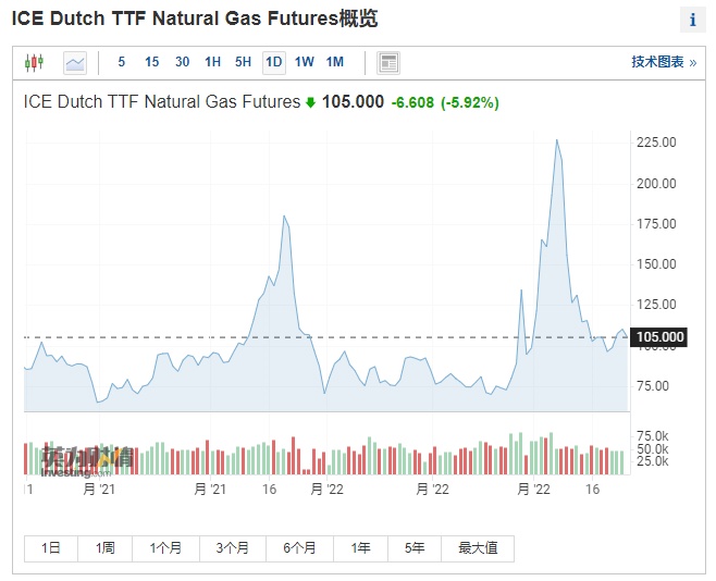 截至发稿,荷兰TTF基准天然气期货价格跌5.92%,报105.00欧元/兆瓦时。