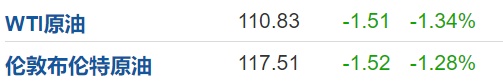 WTI原油期货价格及布伦特原油期货价格均跌超1%,处于每桶110美元上方。