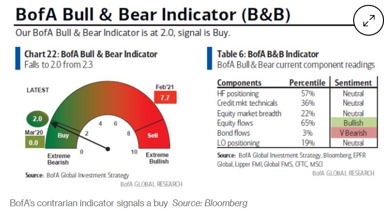 目前的股市低迷是由投资者情绪不佳引发的,美国银行的全球调查显示,基金经理有超过5%的资产配置为现金。报告称,股市和投机级债券市场的资金外流激增也表明,现在是逆向买入时机。