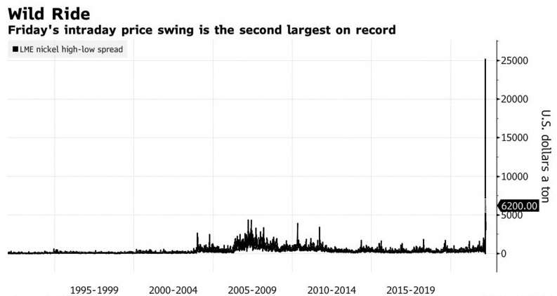 据知情人士透露,这只违约基金预计将从4月份的11亿美元增至20.75亿美元,这是港交所月度压力测试的结果。在此之前,本月早些时候镍价曾飙升至创纪录水平,近几个交易日的剧烈波动使镍价有望实现45%的月涨幅,为1988年以来的最大涨幅。