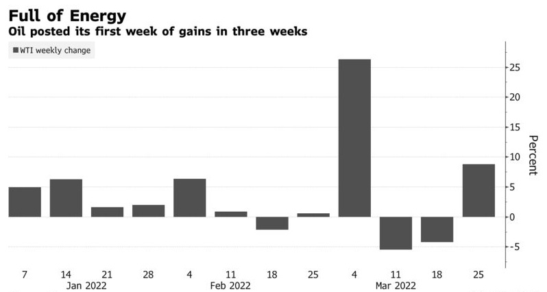 因欧盟继续讨论如何减少对俄罗斯石油出口的依赖,而沙特阿拉伯能源资产也受到攻击,油价三周来首次录得周度上涨。