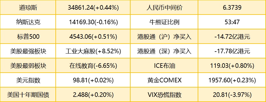 1. 上周五美股收盘,道指涨153.30点,涨幅为0.44%,报34861.24点;纳指跌22.54点,跌幅为0.16%,报14169.30点;标普500指数涨22.90点,涨幅为0.51%,报4543.06点。纳斯达克中国金龙指数跌4.68%。港股ADR指数上涨,按比例计算,收报21662点,较香港收市涨257.56点,幅度为1.19%。