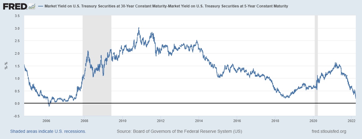 值得注意的是,5年期和10年期美债收益率已经倒挂,目前利差为-2个基点,是2007/2008年金融危机前曲线倒挂以来的最低水平;5年期和30年期美债收益率曲线的趋平程度也达到了2007年以来的最低值,2年期和10年期美债之间的利差也呈螺旋式下降趋势。