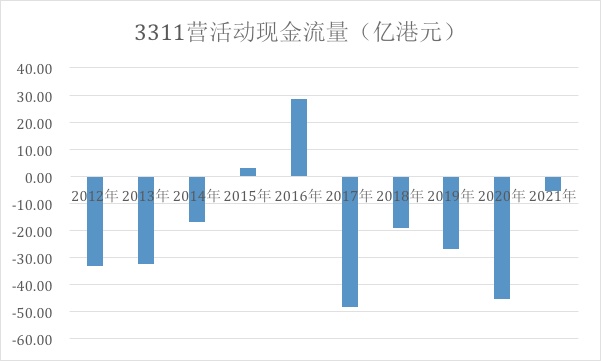 根据公司披露的业绩公告,2021年全年公司经营性现金净流出5.5亿港元,相较于2020年同期的45.3亿港元显著收窄,同时,也处于近十年来的较好水平。