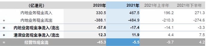 更值得关注的是,如果将2021年上下半年分开来看,公司经营现金流的改善趋势更为明显。2021年上半年公司经营性现金流净流出9.7亿港元,而在下半年成功“转正”,实现净流入4.2亿港元。