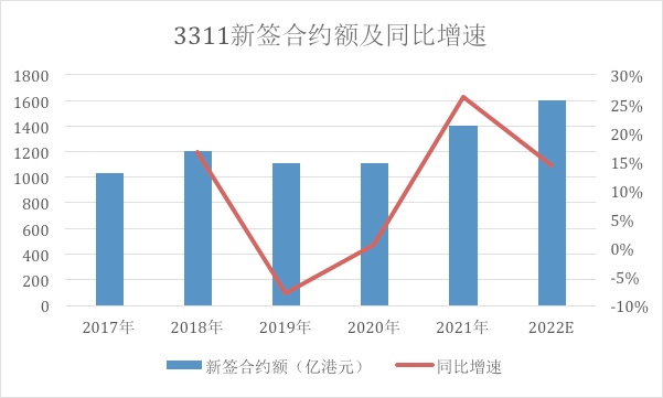 根据公司披露数据显示,2021年公司累计新签合约额为1400.5亿港元,同比增加26.1%,在经历2019年订单下滑、2020年订单停滞之后,2021年公司新签合约额创历史新高,与此同时,增长速度超过25%,重拾高速增长态势,这对于订单规模上千亿元的中国建筑国际来说,着实不易。