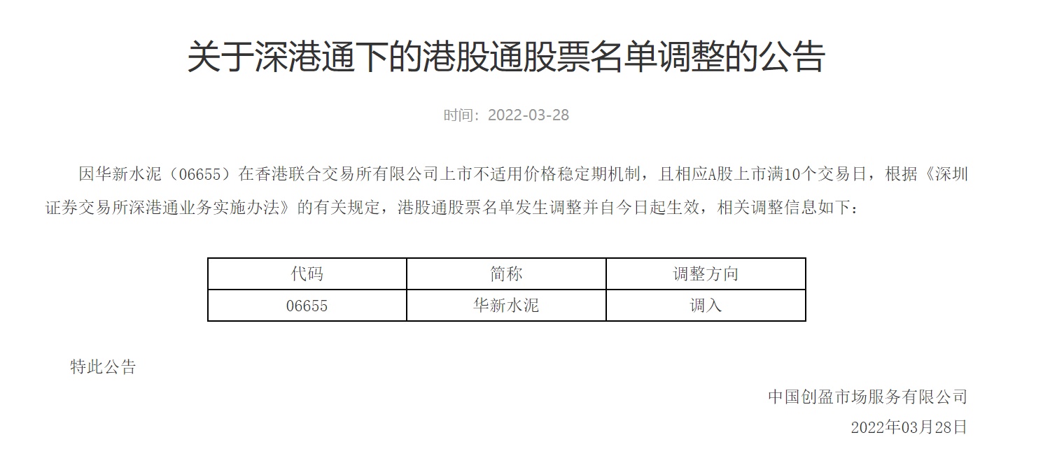 智通财经APP获悉,3月28日,深交所发布公告称,因华新水泥(06655)在香港联合交易所有限公司上市不适用价格稳定期机制,且相应A股上市满10个交易日,根据《深圳证券交易所深港通业务实施办法》的有关规定,港股通股票名单发生调整并自今日起生效,调入华新水泥。