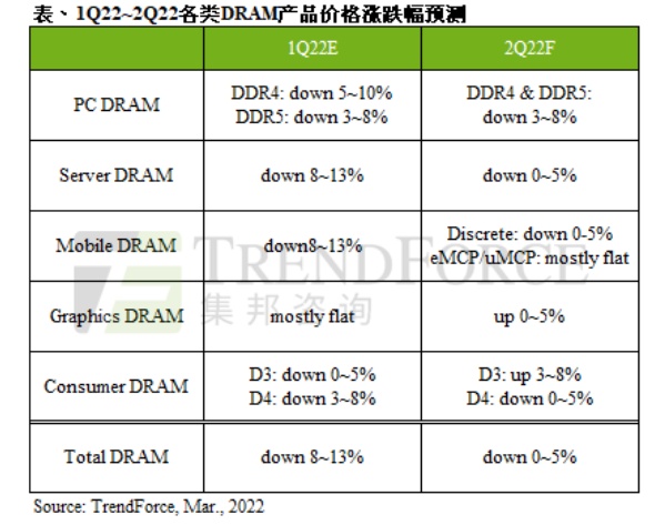 PC DRAM方面,受俄乌冲突影响,引发PC OEM对第二季的订单采保守备货策略,且可能持续影响下半年旺季订单情形,进而下修今年的出货目标,然而整体供给位元却仍在增长,故第二季PC DRAM价格跌幅再扩大至3~8%,且可能会进一步恶化。