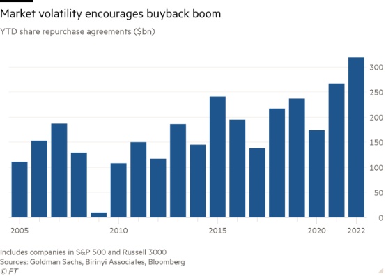 罗素3000指数的平均股价今年已下跌逾30%,这使得那些认为自己的股票被低估的公司可以以同样的价格但买入更多股票。随着各集团应对通胀加剧和供应链问题,收益增长预计也将放缓,这将增加回购作为一种平滑收益方式的吸引力。