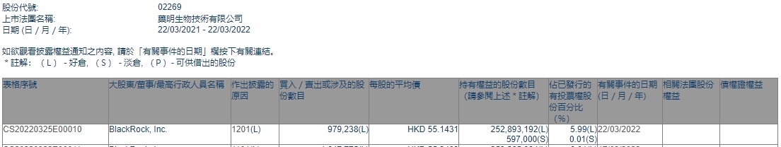 智通财经APP获悉,香港联交所最新资料显示,3月22日,贝莱德减持药明生物(02269)97.9238万股,每股作价55.1431港元,总金额约为5399.82万港元。减持后最新持股数目约为2.53亿股,最新持股比例为5.99%。