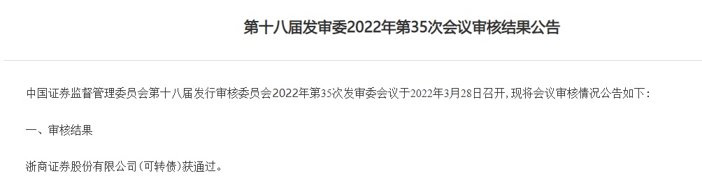 智通财经APP获悉,3月28日,中国证监会发布第十八届发审委2022年第35次会议审核结果公告,浙商证券股份有限公司(浙商证券,601878.SH)可转债获通过。