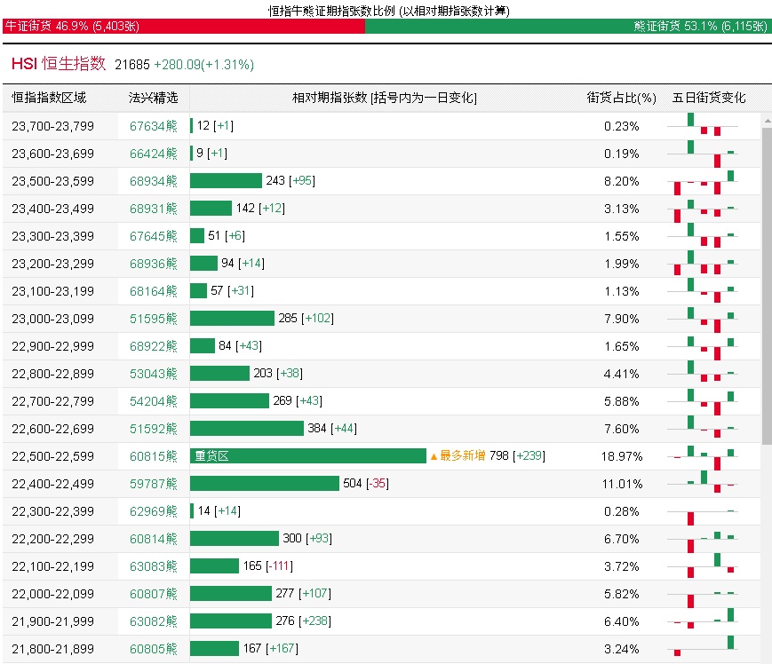 法兴恒指牛熊证街货分布图中的数据显示,熊证街货重货区在22500-22599区间,该区间最新熊证数量为798张,较上一交易日增加239张;最多新增在同一区间。