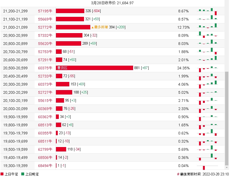 牛证街货重货区和在20500-20599区间,该区间最新牛证数量为881张,较上一交易日增加87张;最多新增在21000-21099区间,该区间最新牛证数量为394张,较上一交易日增加209张。