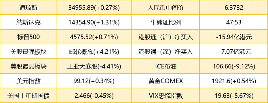 1. 隔夜美股收盘,道指涨94.65点,涨幅为0.27%,报34955.89点;纳指涨185.60点,涨幅为1.31%,报14354.90点;标普500指数涨32.46点,涨幅为0.71%,报4575.52点。港股ADR指数上涨,按比例计算,收报26261点,较香港收市涨77.31或0.29%。