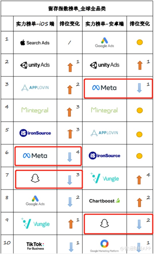 从整个报告来看,苹果 IDFA 新政后最大的变动莫过于竞争格局发生了变化,Meta、Google Ads、Snapchat等巨头平台的垄断被进一步打破。智通财经APP发现,在全球全品类的留存榜单中,无论是iOS端亦或是安卓端,Meta、Snapchat的排名均出现了下滑,其中,Meta在iOS端的排名下滑4位至第六名,在安卓端的排名下滑1位至第三名;Snapchat在iOS端的排名下滑3位至第七名,在安卓端的排名下滑2位至第九名。