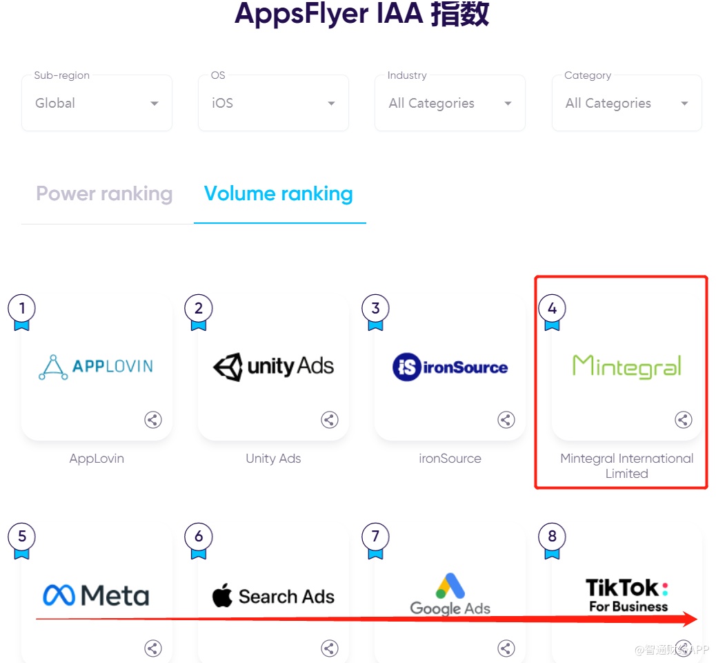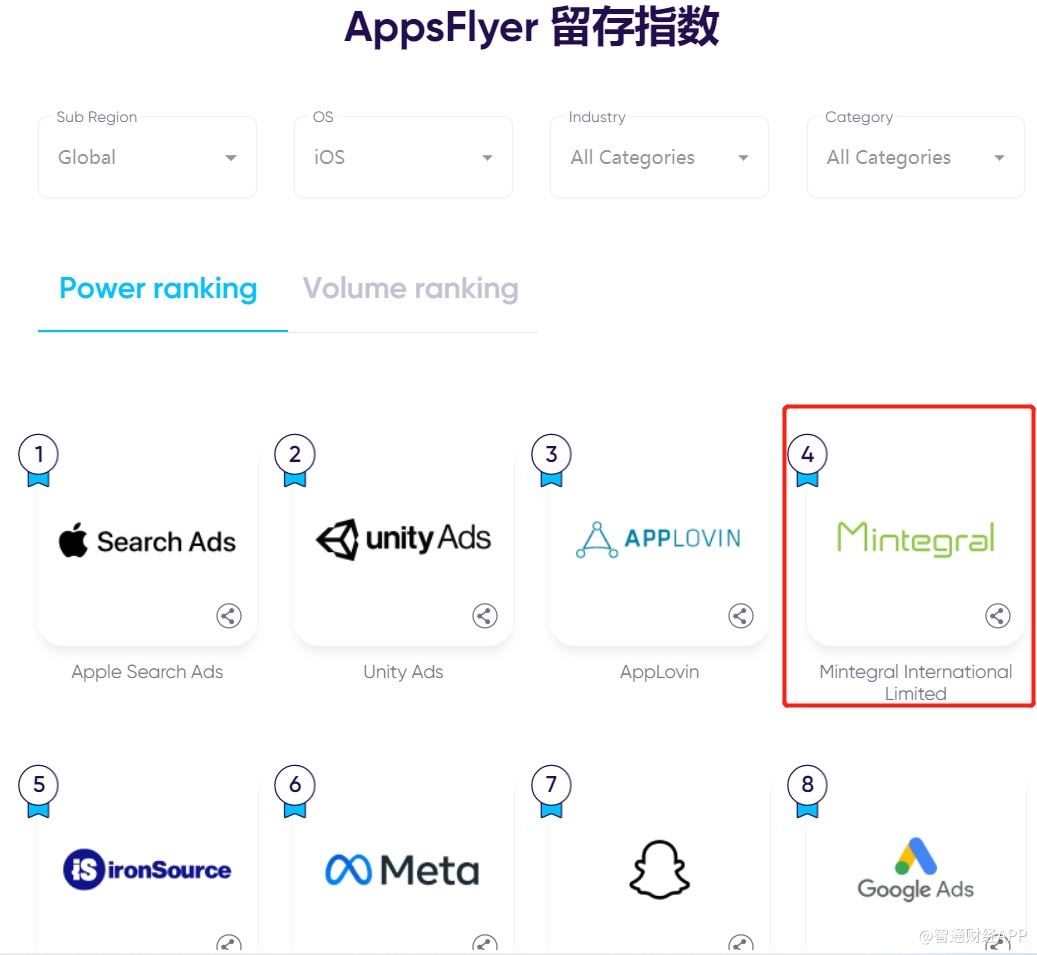 值得注意的是,除游戏外,Mintegral亦加速平台对其他领域的覆盖,其在全球iOS非游戏应用实力总榜中排名第5,流量实力覆盖所有应用品类,这将为Mintegral拓展优质流量奠定坚实基础。