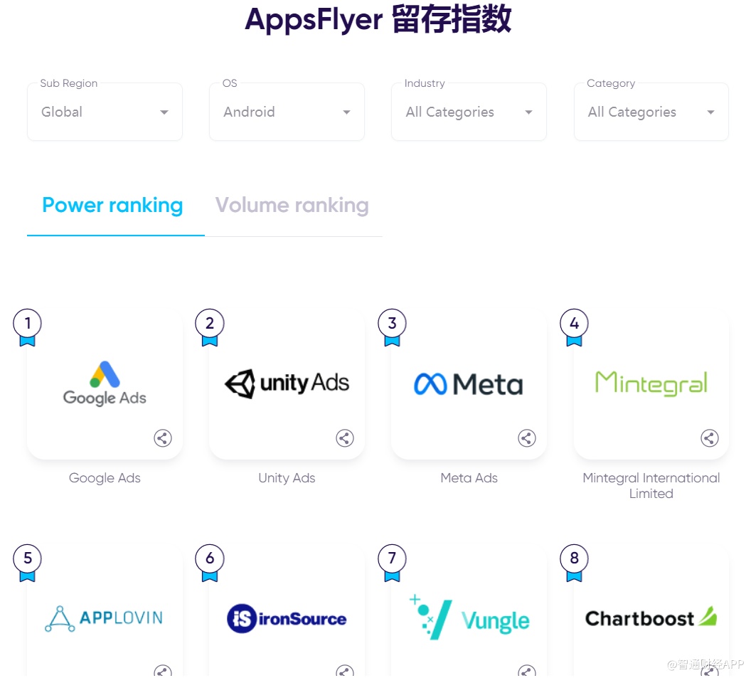 在留存指数安卓端的全行业实力榜单中,Mintegral 保持了第四名,这使其成为在本次全球留存实力榜中,同时跻身 iOS及安卓双端榜单前4的全球五强中的唯一中国平台,也是榜单中少数实力排名优于安装量级的广告平台,证明 Mintegral 能以同样的流量规模,带来质量更优的用户和留存表现。