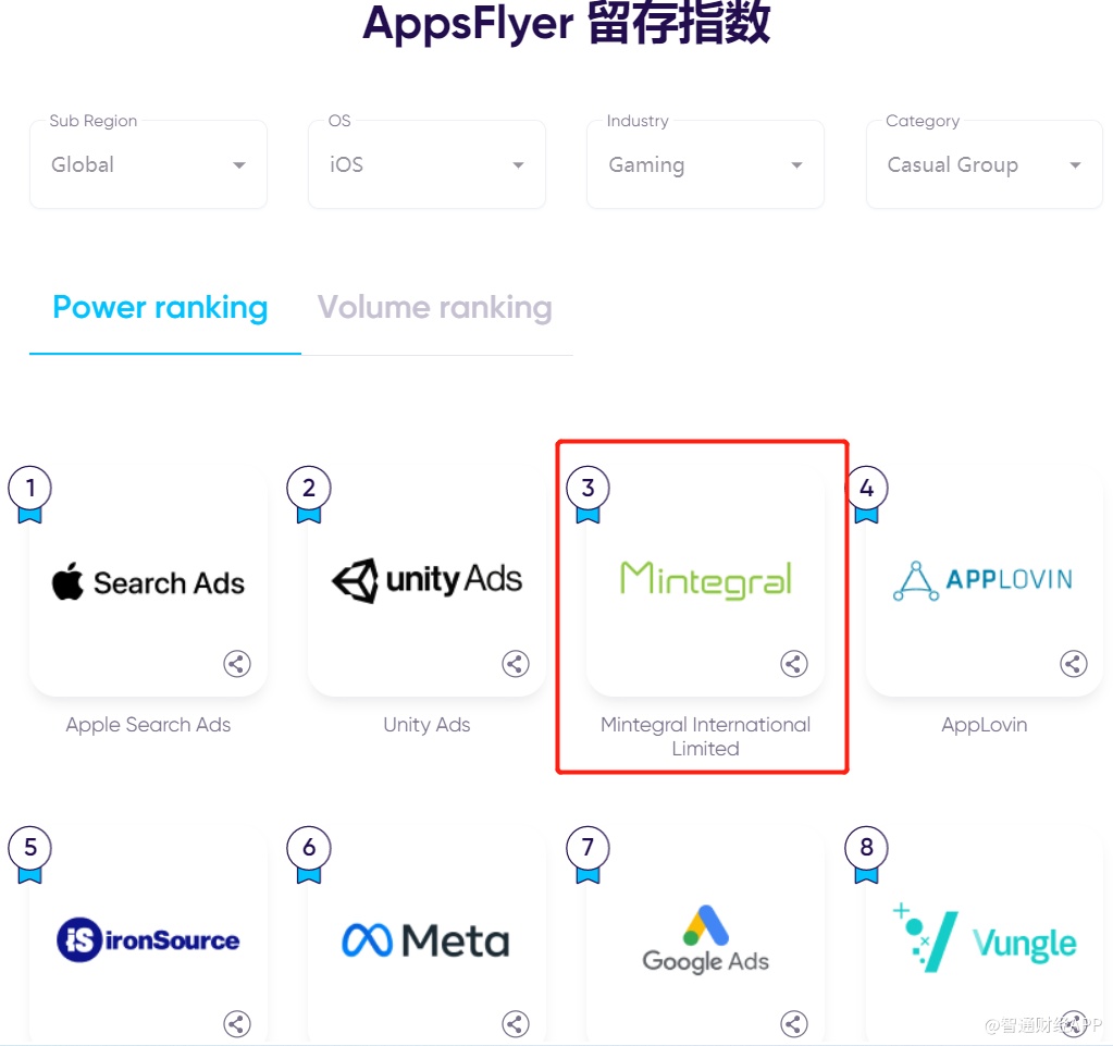 在异军突起的第三方平台中,applovin、unity、Mintegral等表现突出,其中又以汇量科技(01860)旗下的Mintegral的综合实力最为亮眼。其凭借覆盖全球的优质流量以及优异的IAA变现实力,一举斩获全球全品类应用留存实力榜双端4强、IAA指数全球游戏实力榜iOS端5强、安卓端6强,共列席690+项榜单,覆盖休闲、超休闲、中重度、模拟等各类游戏,及生活与文化等非游品类。