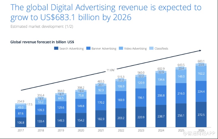据Statista预计,得益于数字化在广告行业的持续渗透以及经济的增长,全球数字化广告行业的市场规模将从2022年的5153亿美元增至2026年的6831亿美元,年复合增速7.39%。且从细分赛道来看,程序化广告凭借高效、精准的优势有望在市场中持续扩大规模,据Statista数据表明,程序化广告在广告行业的占比有望从2022年的82%升至2026年的86%,即从4225亿美元增至5874.66亿美元,年复合增速8.6%。