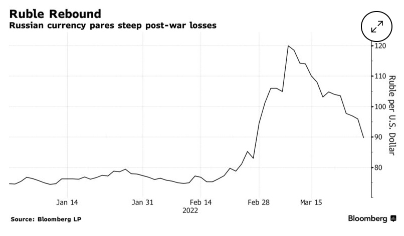 此前,因制裁措施不断增加,企业纷纷撤离俄罗斯,投资者纷纷抛售俄罗斯资产。战争爆发后的头两周内,卢布兑美元一度暴跌33%而在之后,俄罗斯央行采取了一系列措施救市,以遏制俄罗斯经济被孤立所带来的损害,其中包括为防止资金流出俄罗斯而实施的资本管制。此外,俄罗斯还开始要求天然气出口必须以卢布计价,不过一些国家已拒绝了这一要求。