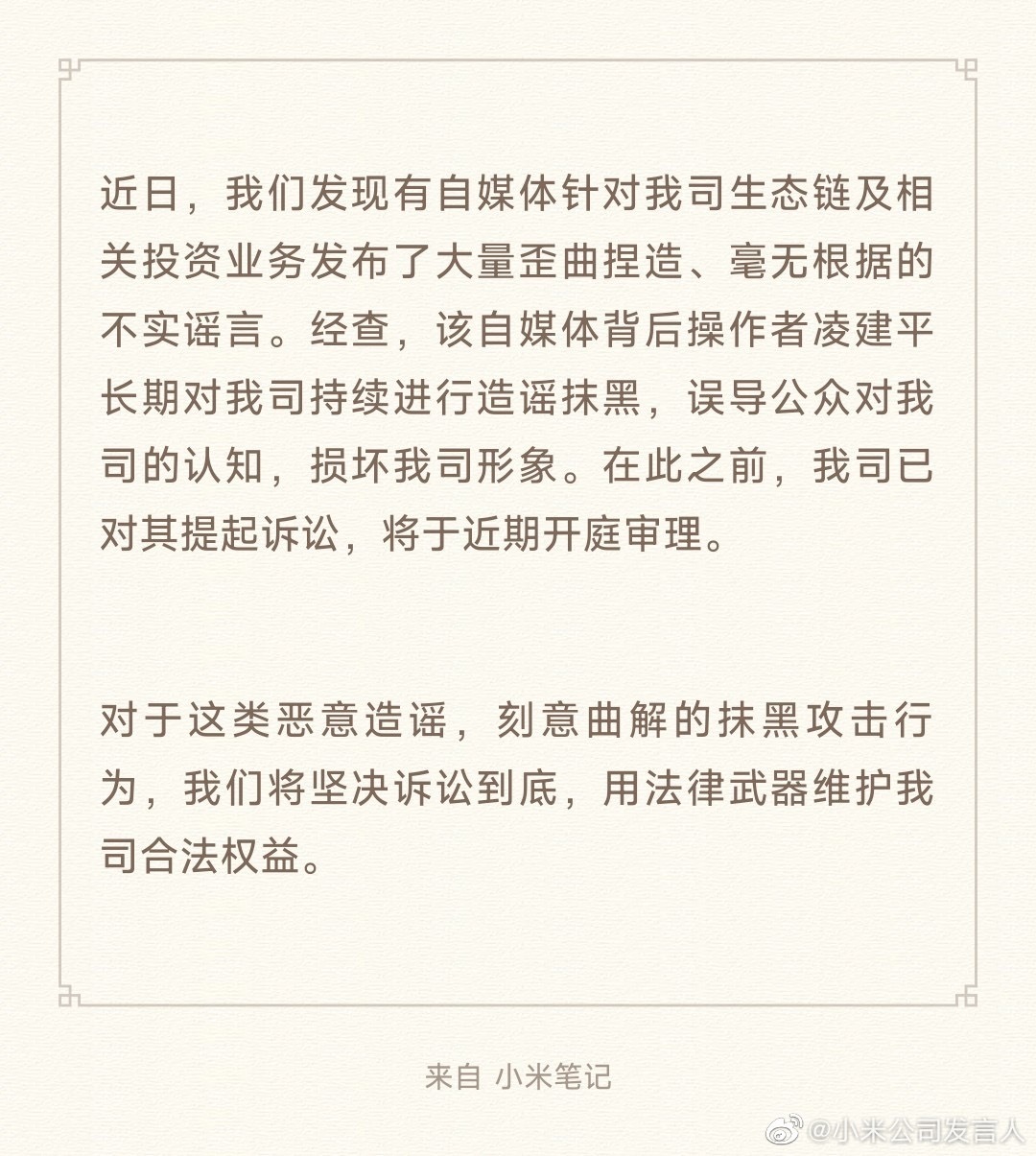此外,小米公司发言人29日在其官微发布声明称:“近日,我们发现有自媒体针对我司生态链及相关投资业务发布了大量歪曲捏造、毫无根据的不实谣言。经查,该自媒体背后操作者凌建平长期对我司持续进行造谣抹黑,误导公众对我司的认知,损坏我司形象。在此之前,我司已对其提起诉讼,将于近期开庭审理。对于这类恶意造谣,刻意曲解的抹黑攻击行为,我们将坚决诉讼到底,用法律武器维护我司合法权益。”