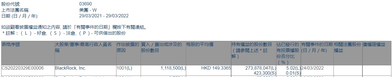 智通财经APP获悉,香港联交所最新资料显示,3月24日,贝莱德增持美团-W(03690)111.85万股,每股作价149.3365港元,总金额约为1.67亿港元。增持后最新持股数目约为2.74亿股,最新持股比例为5.02%。