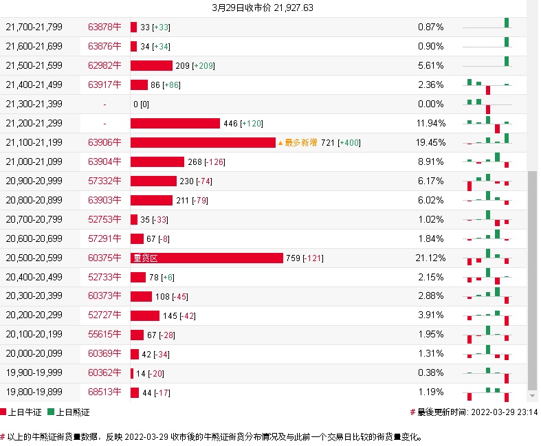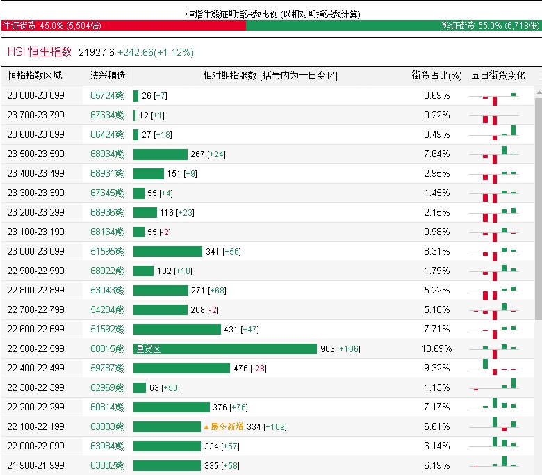 法兴恒指牛熊证街货分布图中的数据显示,熊证街货重货区在22500-22599区间,该区间最新熊证数量为903张,较上一交易日增加106张;最多新增在22100-22199区间,该区间最新熊证数量为334张,较上一交易日增加169张。
