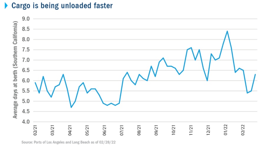此外,船舶卸货速度加快。平均停泊天数已降至近六个月低点。这一点意义重大,因为船舶通过港口的速度越快,供应链拥堵的缓解速度就越快。