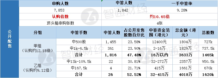 其中,公开配售申购人数7853人,一手中签率9.28%,认购倍数约10.65倍。