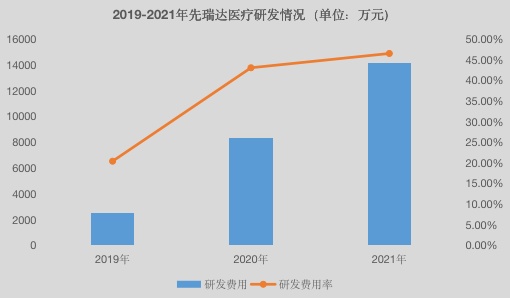 作为全身血管介入医疗器械的执牛耳者,先瑞达医疗一贯对于研发高度重视,且近年来仍一直在加码研发端的投入。2019年-2021年,公司的研发费用分别为2547.9万元、8348.7万元、1.41亿元,同期研发费用率分别为20.4%、43.04%、46.5%,两组数据均呈稳步递增态势。
