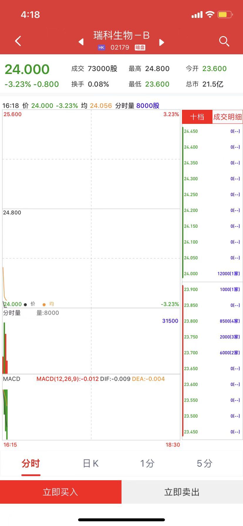 智通财经APP获悉,瑞科生物-B(02179)将于3月31日(星期四)在香港挂牌。截至发稿,利弗莫尔证券暗盘交易显示报价24港元,较招股价24.80港元跌3.23%。每手500股,不计手续费,每手亏400港元。