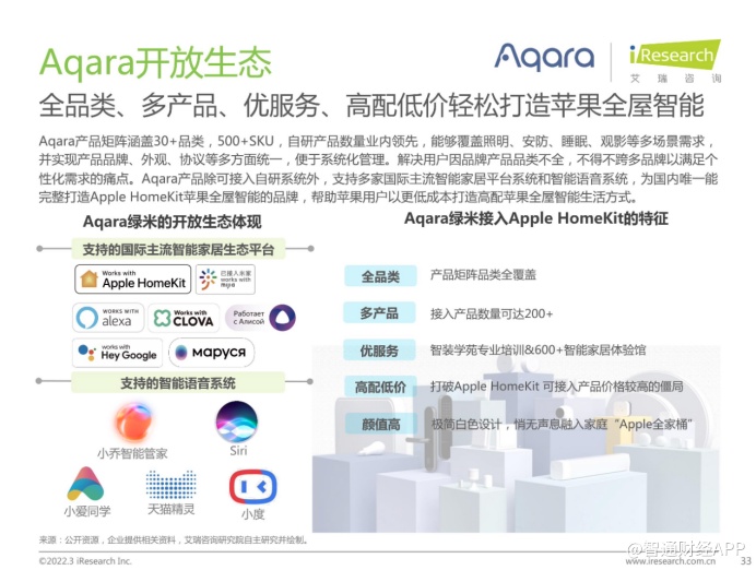 其中,基于出色的产品力表现,Aqara绿米与Apple和Google两大国际品牌已实现深入合作,两者在发布会上均提及Aqara绿米品牌。其中,Aqara绿米已成为国内接入Apple HomeKit中数量最多、体验场景最完整的品牌,也是国内唯一仅依靠单一品牌便可实现HomeKit全屋智能的品牌。