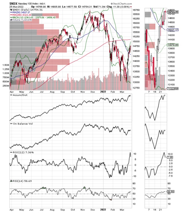 而与标普500指数相比,纳斯达克100指数(NDX)处于挣扎阶段,近期纳指也只是受到工业和能源股推高。因此,纳指看涨趋势要得到确认,需要看到以下情况: