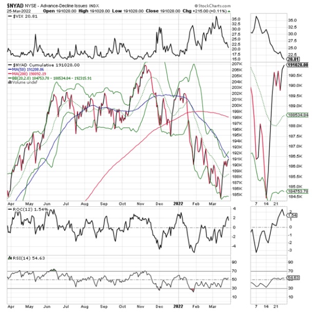市场观点令投资者非常困惑,但从技术图表分析,如果恐慌指数VIX继续下跌,纽交所腾落线(NYAD)继续上升,股市可能会在短期内走高。